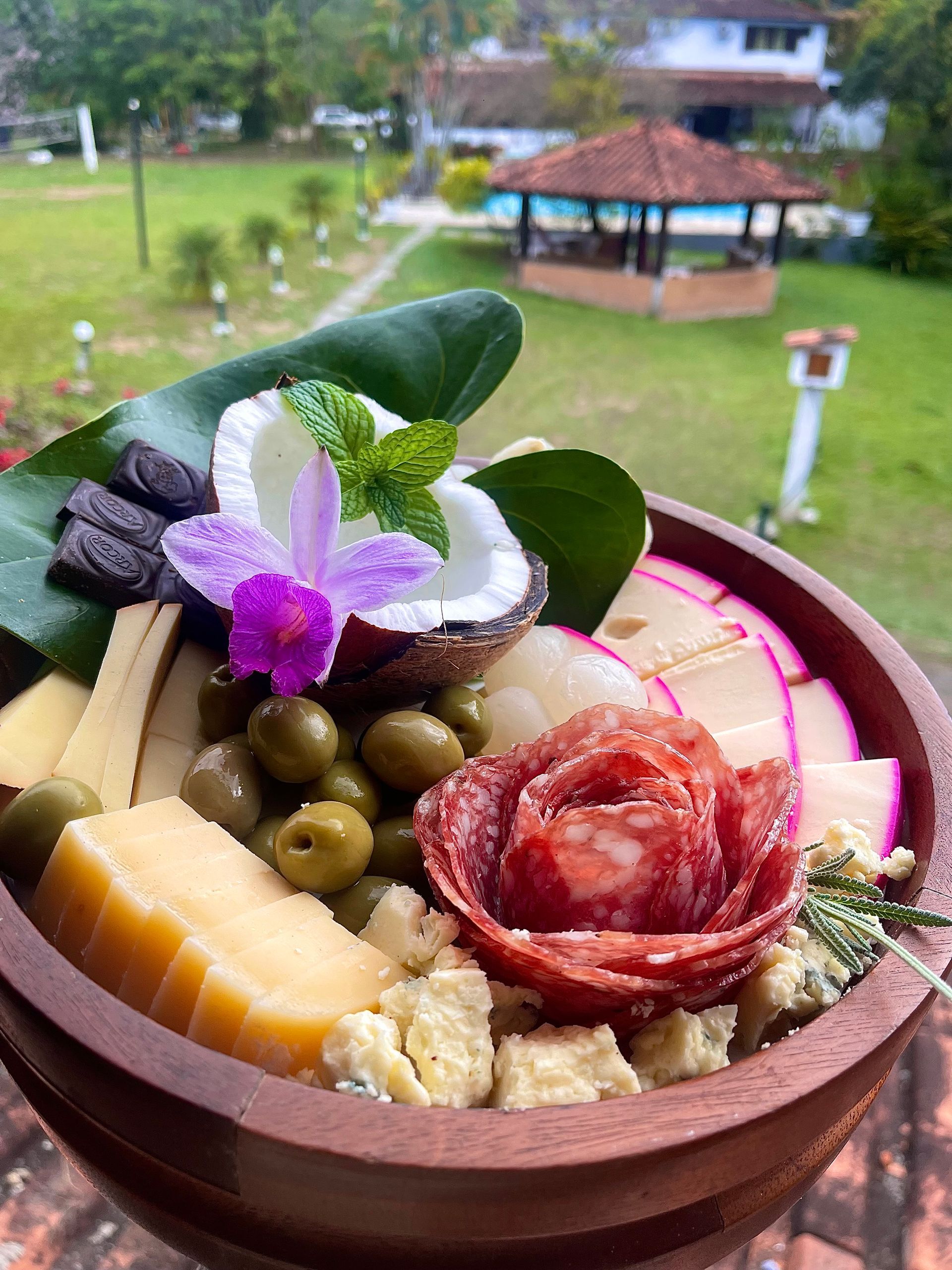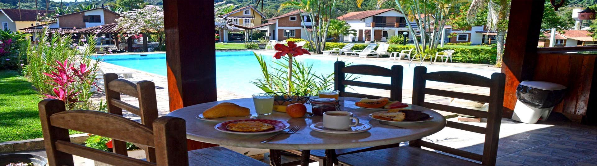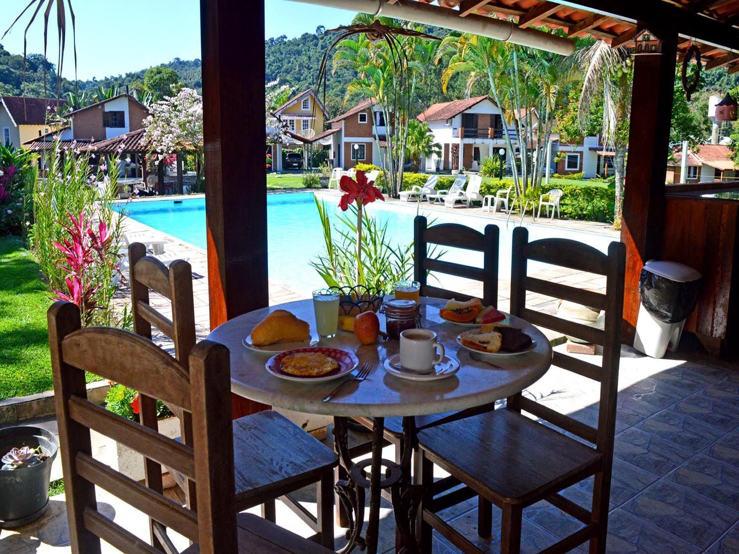 Para a refeição mais importante do dia, apresento nosso tranquilo espaço café da manhã! Fica á beira da piscina com vista privilegiada para o jardim.