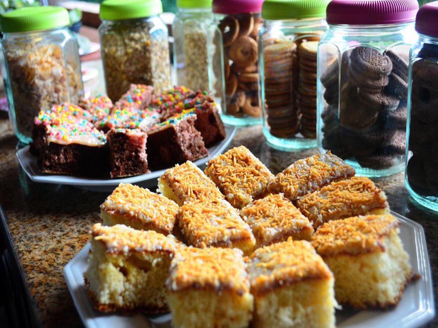 Pães, bolos caseiros, torradas, queijo minas, frios, frutas, café e leite, sucos, biscoitos recheados, bolachas, cereais, granola, aveia, mel e outros saborosos itens!!